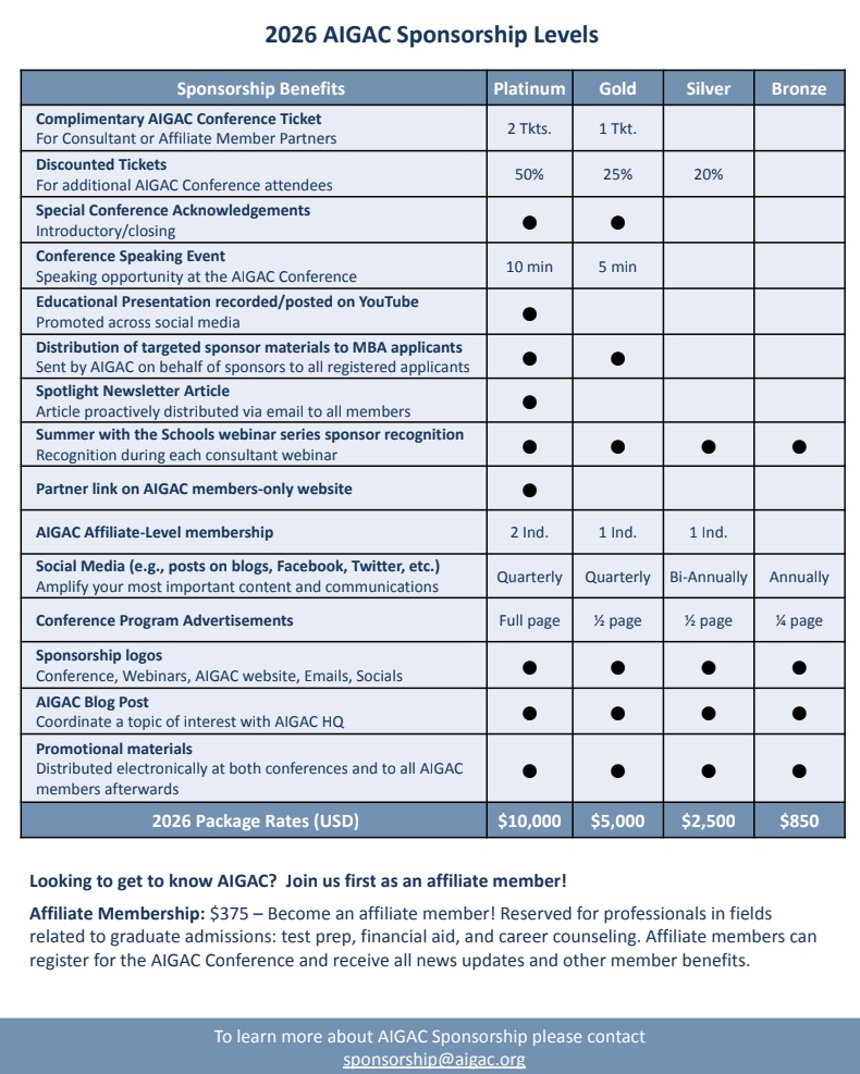 Partner with AIGAC to connect with top graduate admissions consultants, business schools, and industry leaders. AIGAC sponsors gain direct access to a global network of professionals shaping the future of graduate admissions. To learn more about AIGAC Sponsorship please contact us using the form below.